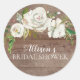Pretty bridal shower favour seal featuring a watercolor white floral bouquet set on a rustic wood background