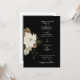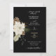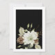 Both clean and decorative, this rustic wedding invitation features a lovely white flower with pinecones accent on a black background.