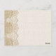 Elegant white lace on burlap shabby chic wedding table number postcard featuring white lace on linen natural burlap or hessian that covers two corners of a white rectangle with beige burlap border. Text in brown. Note that lace and burlap are all “printed on” and not real fabric. This elegant, shabby chic sophisticated and romantic design with a rustic essence is part of a wedding set and is perfect for a country chic or western spring, summer or fall/autumn wedding with a neutral colour palette.