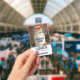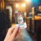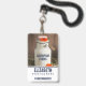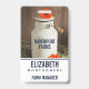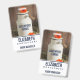 Name badge with a rustic theme. A photograph of a white milk jug and a couple of orange flowers placed around the milk can. Sitting in a barn on some hay. Wooden panels in the background.