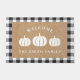 Custom-designed autumn fall decorative doormat featuring rustic farmhouse style buffalo check pattern and white pumpkins design with personalised family name.