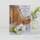 Invite guests to your upcoming informal yet elegant March, April or May marriage ceremony and reception with the charming Rustic White Tulips Country Barn Wedding Invitation. This casual custom western ranch nuptial invite features a quaint floral photograph of a bouquet of white tulip flower blossoms, white pearl necklace, white bridal veil and vintage lace trimmed white linen handkerchief with a brown barn wood background. Perfect inspo or idea for your relaxed barn party celebration event. Available as a printed invitation for mailing or as a digital download for easy sharing digitally online.