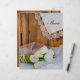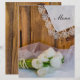 The charming Rustic White Tulips Country Wedding Menu can be personalized with the details of the meal that you will serve at your March, April or May spring time bridal shower luncheon, marriage reception dinner or post wedding brunch. This casual yet classy custom western ranch theme nuptial menu features a quaint floral photograph of a bouquet of white tulip flower blossoms, white pearl necklace, bridal veil and a vintage lace trimmed linen handkerchief with a brown barn wood background.