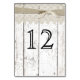 Rustic cottage chic wedding table number card done in a distressed white washed wood look. Graphics of lovely ivory crocheted lace, at the top, and an ivory double ribbon tied in a knot runs across the width of the lace header. The large black number is ready to personalise for each table at your reception. Matching products available.
