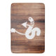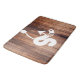 Rustic lakehouse style bath mat with a white worm on a hook and dark wooden planks design.