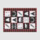 Rustic wilderness animals and symbols in black and white over a buffalo check plaid pattern in black and red.