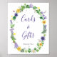 This is a rustic wildflower and greenery themed cards and gifts sign for a bridal shower. The design features a wreath made with a variety of spring wildflowers including yellow daffodils, purple pansies, clovers, lavender, sweetpeas, dandelions, tulips and fern and ivy greenery. It also includes a few ladybirds and a sweet dragonfly. Customise the text as required. Please contact the designer for any queries regarding this design or for any matching products that aren't available.