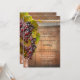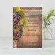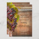 Wedding invitation featuring a rustic wine barrel, vine and grapes with a rope and lace. This invitation has an RSVP card and is part of a collection.