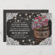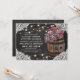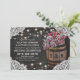 Stylish country wedding invitations featuring a rustic black chalkboard backdrop, bridal lace corner decoration, string twinkle lights, pink roses & gypsophila flowers, a winery wooden barrel wiith your initials and a piece of knotted string.