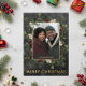 Introducing our enchanting foil Christmas card, where timeless elegance meets the beauty of the season. The rich charcoal black background, artfully distressed with soft white accents, sets a captivating tone. Your favourite photo will shine, surrounded by a delicate foil frame that adds a touch of refinement. Embrace the spirit of winter with a breathtaking frame of lush greenery, featuring holly adorned with rich red berries, mistletoe with its delicate white berries, and the timeless allure of green pine. This winter wonderland-inspired design captures the essence of the season and exudes natural grace and festive charm. Created by Simply Farmhouse Press.