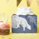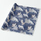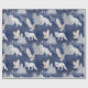 A rich dark blue background with a beautiful mountains scene in a pattern with snowy pine trees, white foxes, and flying snowy owls. This Christmas gift wrap is perfect for your holiday gift wrap this season.