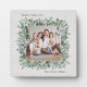 Rustic elegant "Merry Christmas" holiday photo tabletop plaque display sign features a square wreath of winter watercolor greenery framing the family picture. Personalise with your choice of greeting and your family's last name.