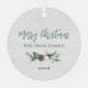 Elegant "Merry Christmas" round metal holiday ornament design features a rustic chic white wood grain background with a wreath of winter watercolor greenery framing a first or last name monogram initial. Personalise the modern and stylish green and charcoal grey wording with your choice of greeting, last name, and the year.