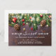 Rustic country new address announcement postcards featuring a dark wooden background, festive christmas tree branches, red & gold tree decorations and string twinkle lights.