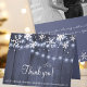 Elegant wedding thank you folded card template with your custom full bleed horizontal landscape orientated photo inside, white snowflakes and string shimmering lights on dark blue grey barn wood background. Suitable for rustic country winter seasonal wonderland weddings.