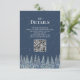 QR code wedding detail card inserts for your rustic winter wedding with a snow covered forest at night in dark blue and white. Use these cards to direct your guest to your wedding website for more details about your accommodations, directions or to RSVP online.