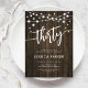 30th Birthday Party Invitation. Rustic design with dark brown wood pattern. Classy invite card featuring fairy string lights and script font. Perfect for a stylish thirtieth bday celebration. Personalize with your own details. Can be customized for any age! Printed Zazzle invitations or instant download digital printable template.