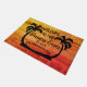 Tropical beach house welcome doormat with a rustic wood background and black palm trees silhouette.