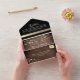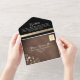 Make a lasting impression with this elegant, modern rose gold and black rustic wood all-in-one wedding invitation. Featuring a stunning combination of faux gold floral lace, simple calligraphy script, and twinkling string lights, this invitation beautifully blends rustic charm with sophisticated style. The back showcases a custom photo of the couple, adding a personal touch to your special day.