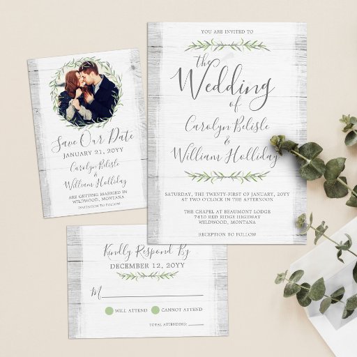 Elegantly simple, naturally chic. Graceful watercolor branches and leaves pair with rustic, weathered wood to create a timeless wedding design with classic elegance.