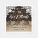 Decorate your rustic country, backyard or barn wedding party with these custom wedding paper napkins featuring burlap hearts against a burlap and rustic wood background adorned with string lights and white floral lace.