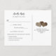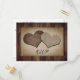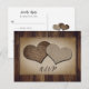 Rustic wedding RSVP postcard with meal selections featuring two burlap hearts on a burlap and wood background decorated with lace.