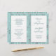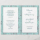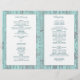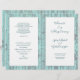 Folded, catholic wedding program template with rustic, blue wood background, printed on the paper of your choice. This layered-look program contains four pages to customise. Solid white panels hold the teal blue text which has a modern appearance of combined handwritten script and printed fonts. Each page has space for lots of text to accommodate religious, church ceremony. The last page (back of program when folded) includes a section for scripture (sample is "Love is patient, love is kind" from 1 Corinthians) and a message from the bride and groom. Each sheet of paper has text on both sides to create one program, which will be folded after purchase.