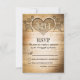 Original and modern country or western wedding themes RSVP with wooden love heart carving and classy typography.