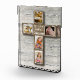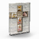 Modern First Holy Communion illustration featuring a wooden cross with pinned communion related images on a rustic background. Easily to change the 2 sample photos of the communicant with your own pictures to personalise the product.