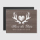 Magnetic save the date cards with Brown Barn wood country chic deer antler design. Part of rustic hunter / hunting wedding theme set. Elegant design with vintage faded heart. Perfect for summer outdoor garden marriages in July and August. Personalise with name of bride and groom plus date of getting married. Customisable background colour. Stylish distressed script typography. Beautiful vector artwork for trendy wedding. Helpful reminder for guest. Handy for on the kitchen fridge.
