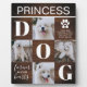 Pet memorial tribute picture plaque featuring 4 photos of you beloved doggy, a rustic wood pattern background, letters that spell out DOG, the words "forever in our hearts", a dogs paw with a remebrance saying, and their name.