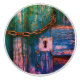 An old door with peeling paint, rusty chain and a keyhole. The paint is an array of pretty colours in blue, green and pink. Rustic but feminine.