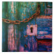Rustic, weathered, painted wood door with a keyhole and chain. In pretty colours of blue, pink and green.