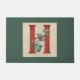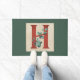 illustrated letter/initial features light faux wood and green background with barn red wood filled Letter H accented by a watercolor stem of eucalyptus leaves.