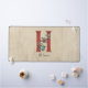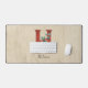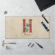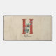 this illustrated letter/initial desk mat features light wood background with barn red wood filled Letter H accented by a watercolor stem of eucalyptus leaves.