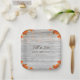 Rustic Grey Wood "Fall In Love" String Lights, Gold Sparkles & Fall Leaves Seasonal Wedding Square Paper Plates.