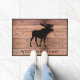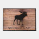 A rustic cabin doormat featuring a warm wood pattern, a walking moose silhouette, and your family last name or cabin name across the bottom. The bold black artwork keeps the look clean and readable while giving your entry that classic lodge feel. Personalize it with your name to welcome guests to a mountain cabin, lake house, hunting camp, or cozy weekend retreat, and gift it for new homeowners, cabin weekends, or winter holidays.