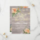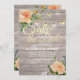 Save The Date Wedding Invitation Card Templates - Faux Gold Foil Script with Peach White Roses Floral and String Lights on Rustic Wood Background.