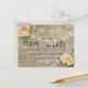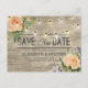 Save The Date Wedding Invitation Postcard Templates - Peach White Roses Floral and String Lights on Rustic Wood Background.