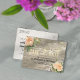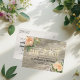 Save The Date Wedding Invitation Postcard Templates - Faux Gold Foil Script with Peach White Roses Floral and String Lights on Rustic Wood Background.