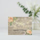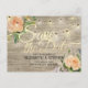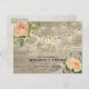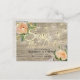 Save The Date Wedding Invitation Postcard Templates - Faux Gold Foil Script with Peach White Roses Floral and String Lights on Rustic Wood Background.