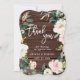 This wedding thank you card features a wreath of watercolor flowers in blush pink and white with green foliage on a rustic wood print background. For more advanced customisation of this design, please click the Customise Further link to change font, size, and colour.