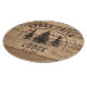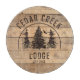 Personalised round cutting board featuring a rustic brown wood plank and scenic forest trees design with your property name or other custom text. Ideal for a family cabin, lake house, rustic lodge or nature retreat and vacation home rental property. ASSISTANCE: For help with design modification or personalisation, colour change, resizing, transferring the design to another product or if you would like coordinating items, contact the designer BEFORE ORDERING via the Zazzle Chat MESSAGE tab or email makeitaboutyoustore@gmail.com.