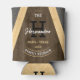 A wooden can cooler with an attractive design: modern + script typography over rustic wood grain. Add your personalised text.
