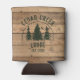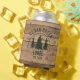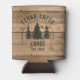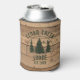 Rustic can cooler featuring brown country wood plank and scenic wilderness green forest trees design personalised with your custom text. Ideal for a family cabin, lake house, rustic lodge and vacation home rental property merchandise or guest favour gifts. ASSISTANCE: For help with design modification or personalisation, colour change, resizing, transferring the design to another product or if you would like coordinating items, contact the designer BEFORE ordering via Zazzle Chat or email makeitaboutyoustore@gmail.com.