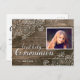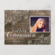 Modern First Holy Communion illustration featuring a rustic wooden background with decorative lace flowers and leaves, modern typography calligraphy script. Easily to change the sample image of the communicant with your own picture to personalise the product.