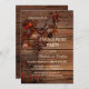Romantic engagement party invitation featuring an autumn tree with colorful leaves, roses and candle lit lanterns on a rustic wood background.