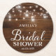 This rustic Bridal Shower round coaster features lights in mason jars and strings of lights with the word "Bridal Shower" against a brown wood pattern background. Check out matching items like invitation, stickers and stamps here https://www.zazzle.com/collections/rustic_wood_mason_jars_and_lights-119202204970019494?rf=238364477188679314