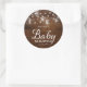 Rustic Baby Shower round sticker featuring lights in mason jars and strings of lights with the word "Baby Shower" against a brown wood pattern background. It's the perfect sticker for a rustic or country baby shower. Check out matching invitation and items like stickers and stamps here https://www.zazzle.com/collections/rustic_wood_mason_jars_and_lights-119202204970019494?rf=238364477188679314