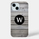Monogram rustic wood look iPhone case. You'll love this rustic and trendy look! White monogram letter in a black circle and a background of old wood slats.